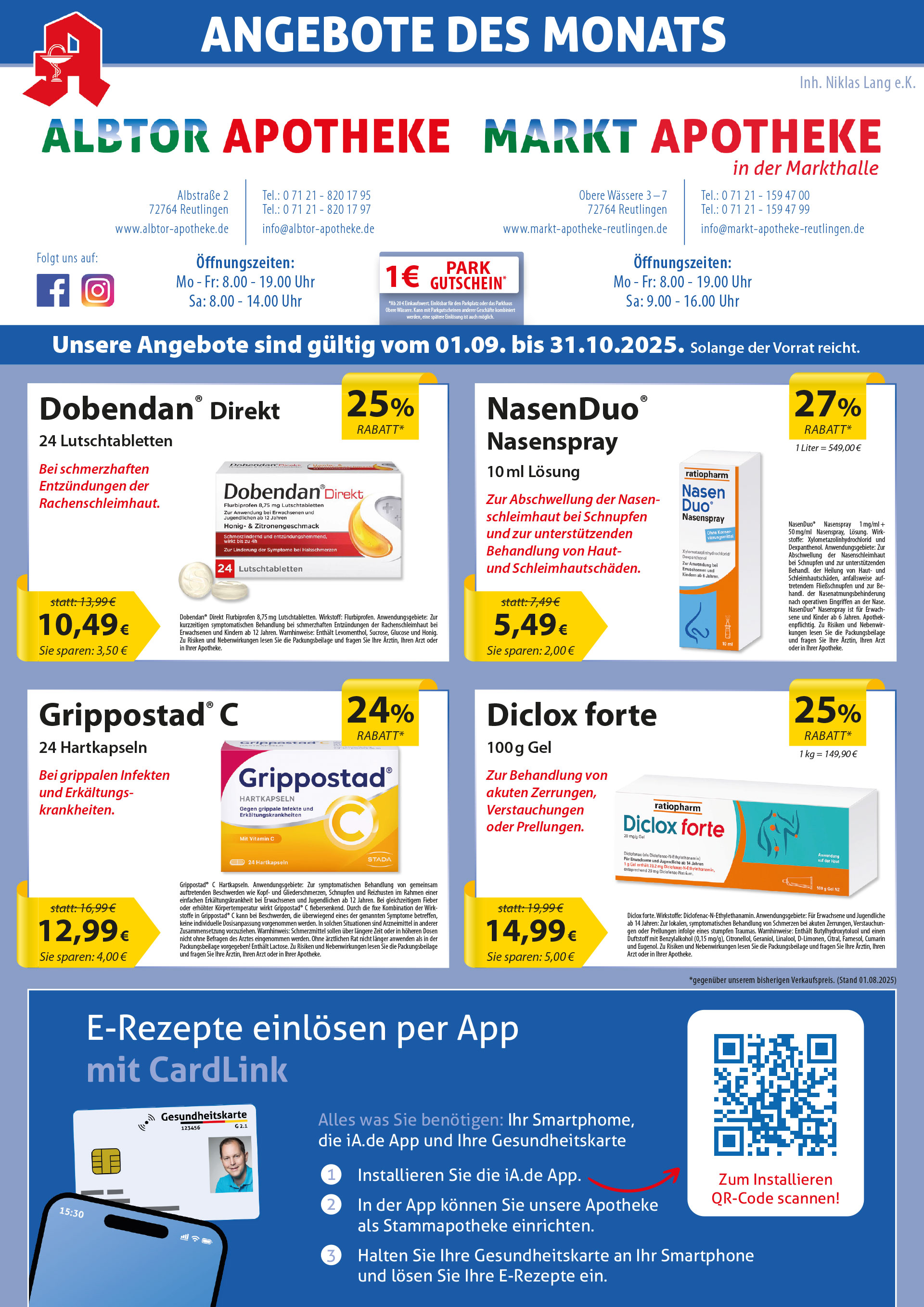 Die digitalen Treuepunkte sind eine freiwillige Leistung der Markt Apotheke in der Markthalle und der Albtor Apotheke in Reutlingen. Es besteht kein Rechtsanspruch. Änderungen vorbehalten.